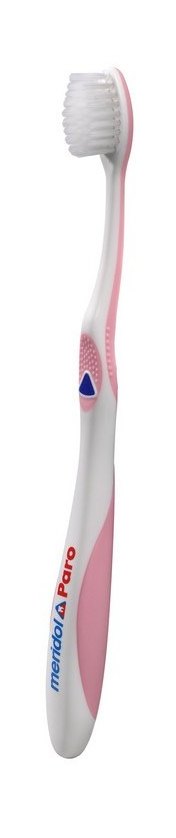 Zubná kefka Meridol má kónické vlákna s jemnými koncami, ktoré chránia ďasná a dôkladne vyčistia všetky zubné povrchy, najmä okraj ďasien.