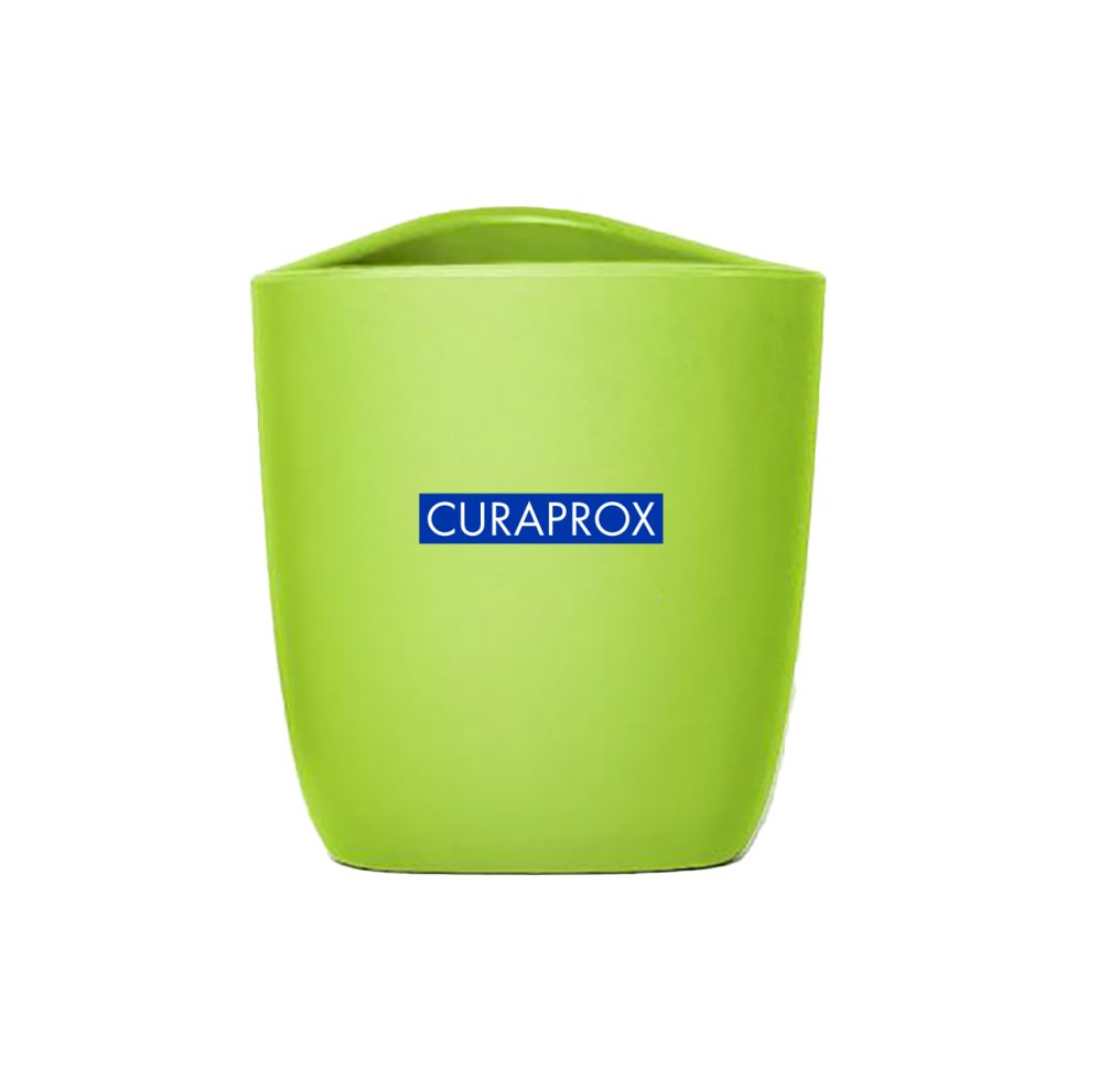Trojboký plastový téglik Curaprox skvele padne do malých detských rúk. Deti ho môžu použiť na vyplachovanie úst po čistení a potom do nej uložiť kefku a zubnú pastu.