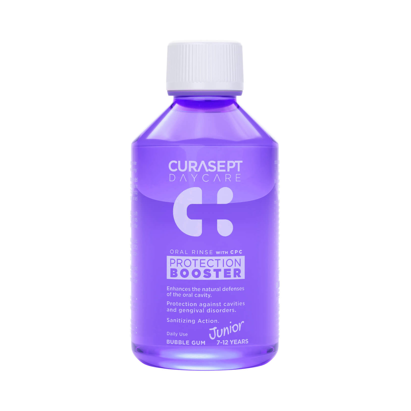 Detská ústna voda s príchuťou žuvačky Curasept Daycare Booster Junior pomáha likvidovať mikroorganizmy v zubnom povlaku. Poskytuje ochranu pred zubným kazom a bráni pred demineralizáciou zubnej skloviny.