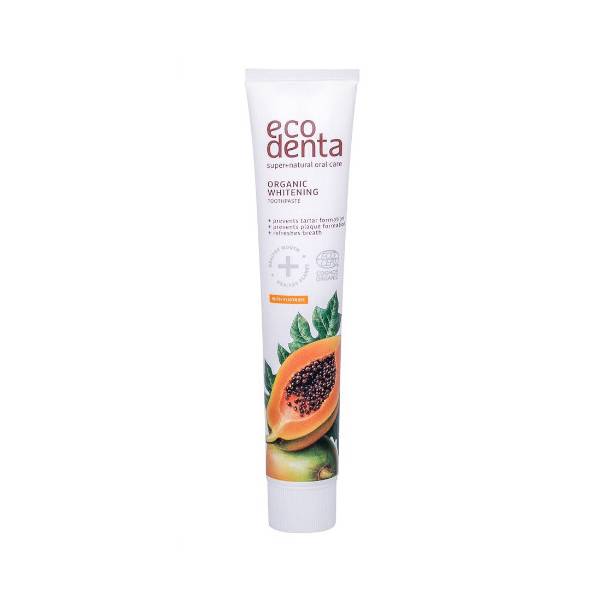 Prírodná zubná pasta s extraktom z papáje Ecodenta Organic Whitening Papaya pomáha zachovať prirodzený odtieň vašich zubov. Pôsobí proti tvorbe zubného povlaku a zubného kameňa.