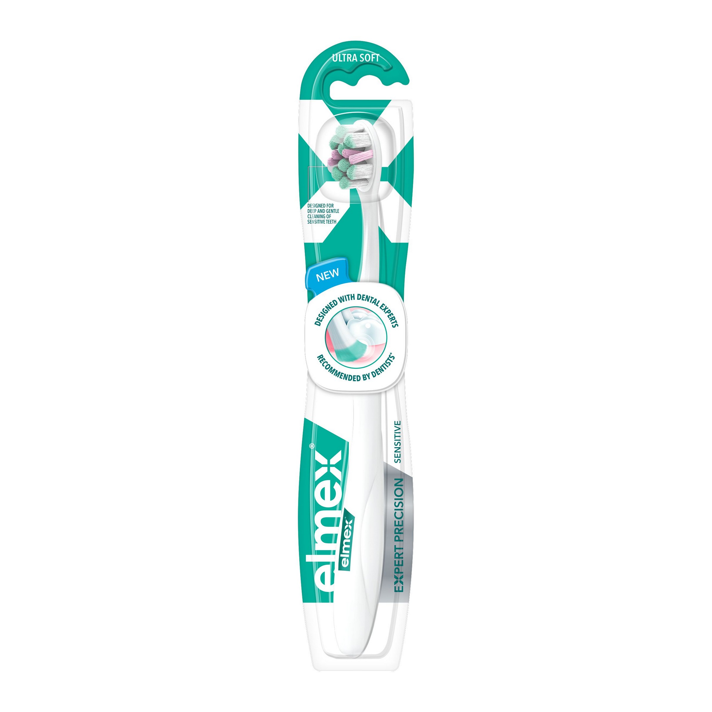 Zubná kefka pre citlivé zuby a ďasná Elmex Expert Precision Sensitive so šikmým tvarovaním a rôznymi sklonmi vlákien zaistí dôkladné a šetrné vyčistenie zubov.