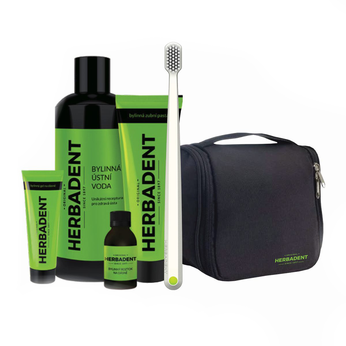 V sade Herbadent Original Bag nájdete všetko pre starostlivosť o vaše zuby a ďasná. Kozmetická taška obsahuje bylinkovú ústnu vodu, gél na potieranie ďasien, bylinnú zubnú pastu, roztok na ďasná a kefku na zuby Herbadent.