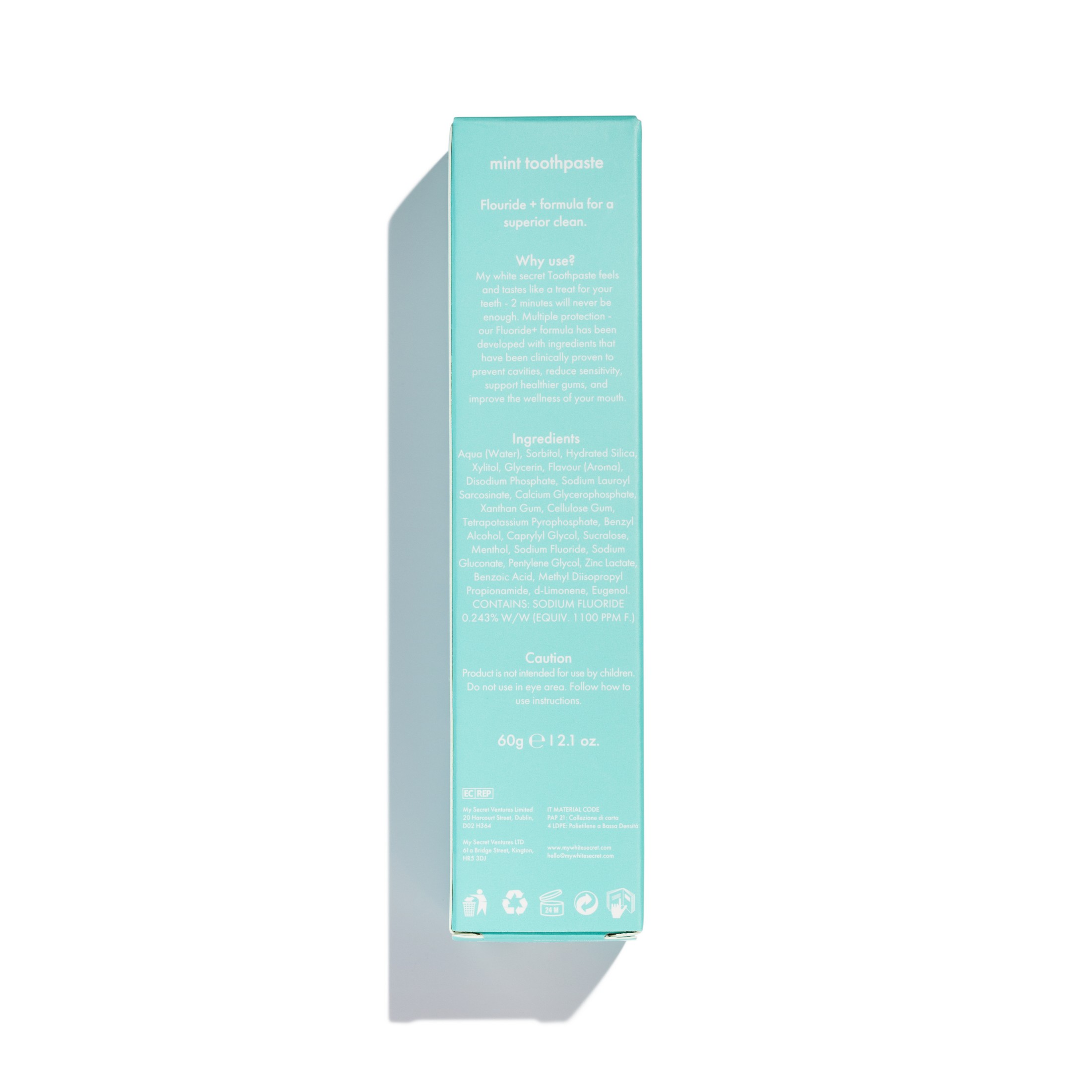 - Aqua, Sorbitol, Hydrated Silica, Xylitol, Glycerin, Aroma, Disodium Phosphate, Sodium Lauryol Sarcosinate, Calcium Glycerophosphate, Xynthan Gum, Cellulose Gum, Tetrapotassium, Pyrophosphate, Benzyl Alcohol, Caprylyl Glycol, Sucralose, Menthol, Sodium Fluoride, Sodium Gluconate, Pentylene Glycol, Zinc Lactate, Benzoic Acid, Methyl Diisopropyl Propionamide, d-Limonene, Eugerol. Contains Sodium Fluoride 0,243%