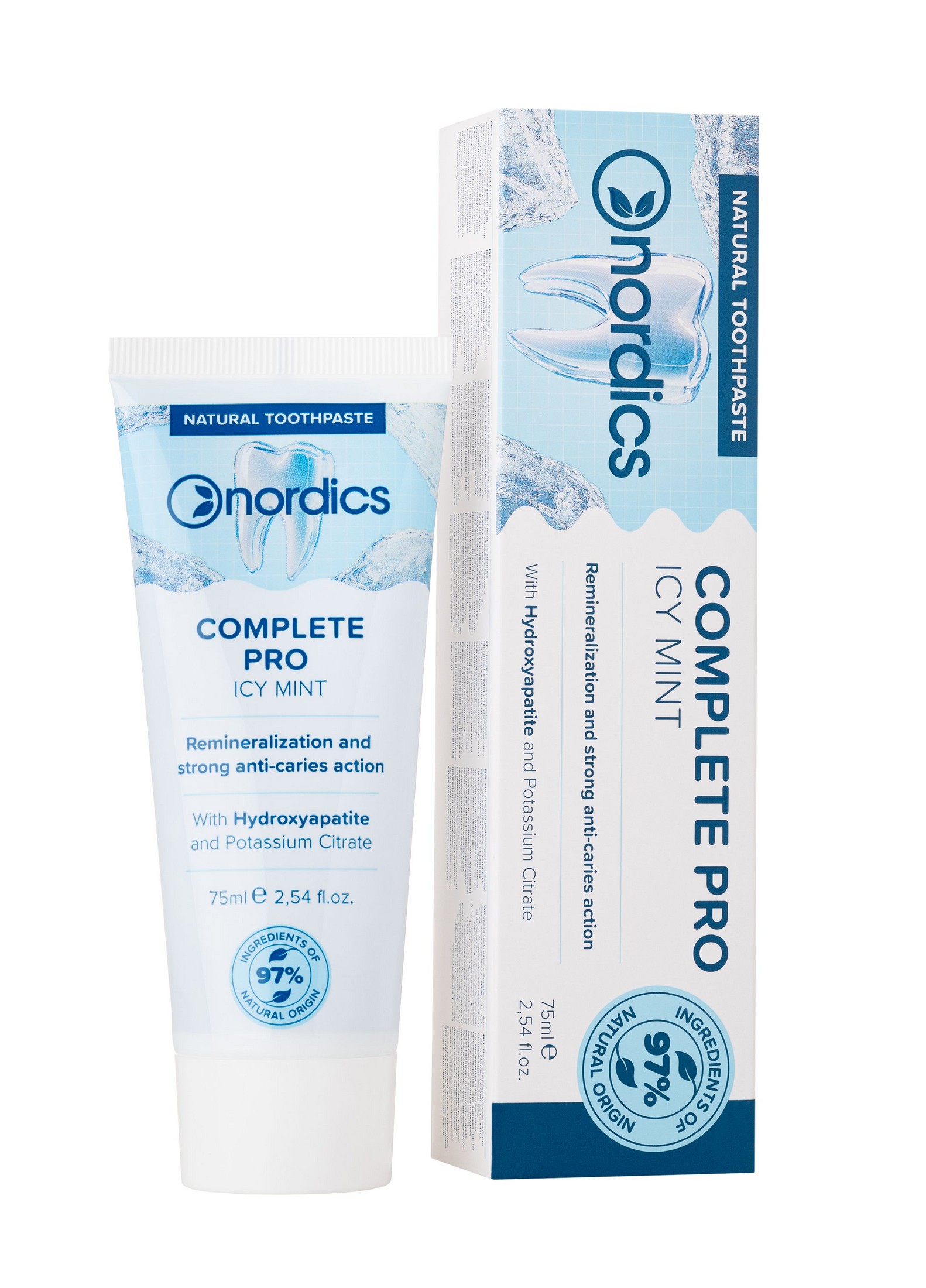 Prírodná zubná pasta s chladivou mätovou príchuťou Nordics Complete PRO pomáha znížiť citlivosť zubov a remineralizuje zubnú sklovinu vďaka obsahu hydroxyapatitu.