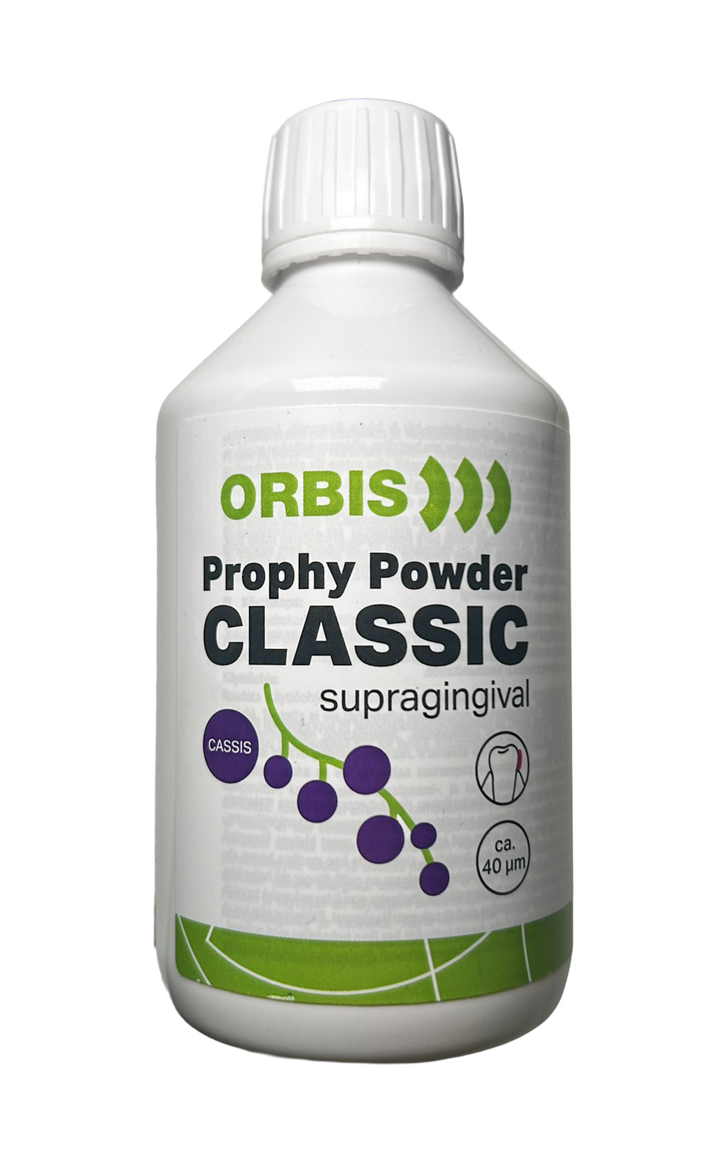 Profylaktický prášok s ríbezľovou príchuťou Orbis Classic je určený na supragingiválne ošetrenie. Spoľahlivo odstraňuje biofilm, škvrny spôsobené kávou, červeným vínom či fajčením a pomáha aj pri odstraňovaní počiatočného zubného kameňa.