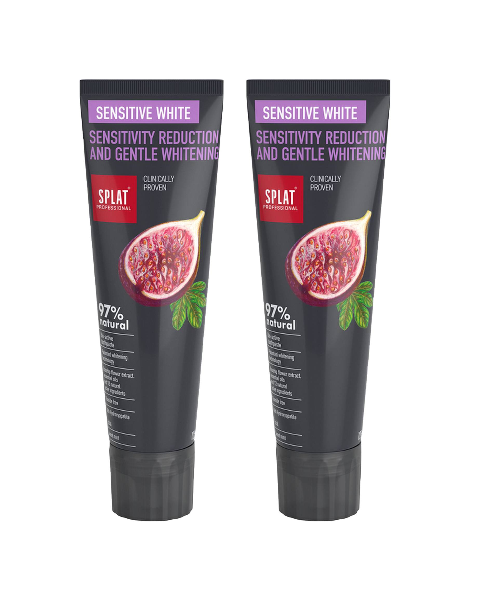 Zubná pasta bez fluoridov Splat Bio Professional Sensitive White obsahuje hydroxyapatit vápnika, ktorý pomáha znižovať citlivosť zubov. Poradí si i s povrchovými škvrnami na zuboch, ktoré jemne odstraňuje vďaka inovatívnemu BIO Sp.White systému. Esenciálne oleje s antibakteriálnymi a protizápalovými účinkami sa postarajú o zdravie ústnej dutiny.