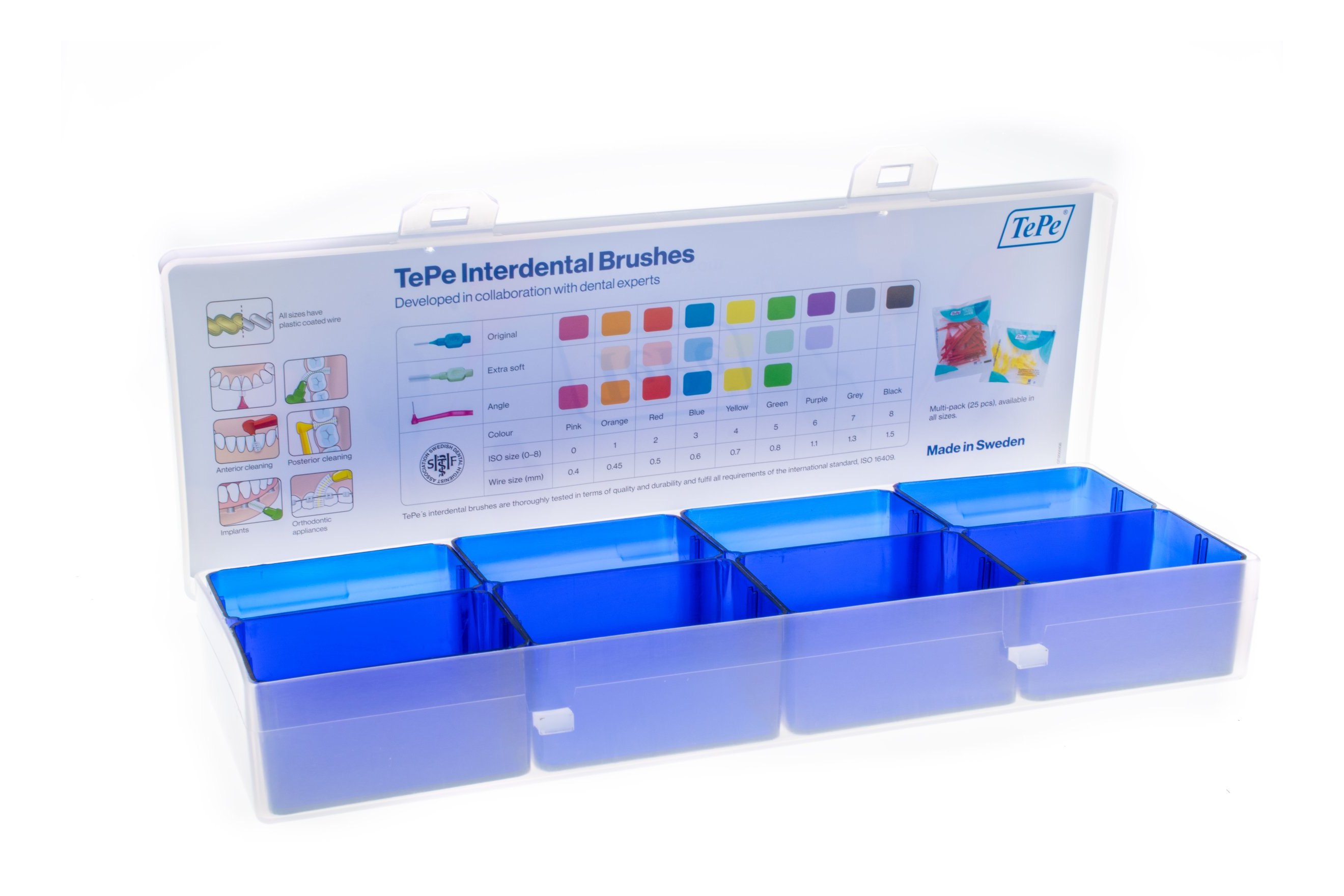 - Priestranný box pre osem veľkostí medzizubných kefiek TePe