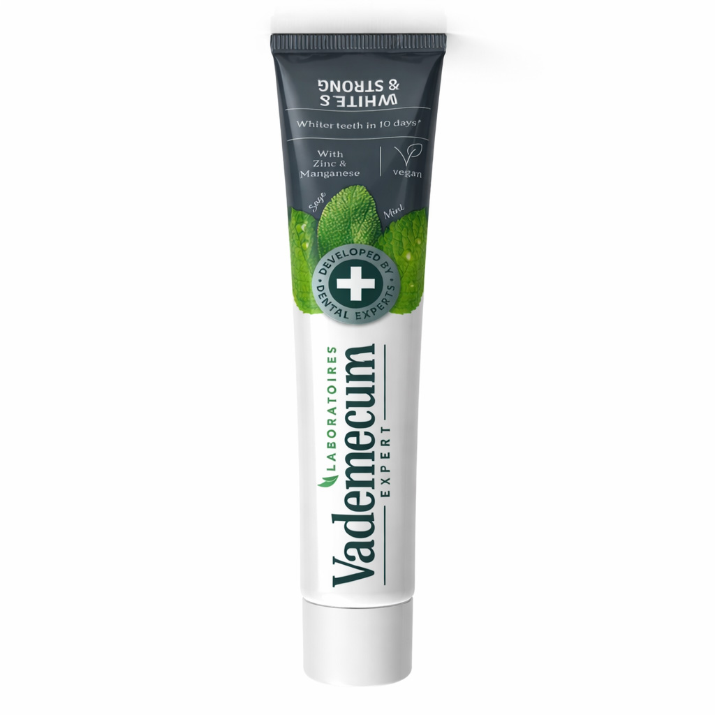 Zubná pasta so zinkom a mangánom Vademecum Expert White&Strong posilňuje zubnú sklovinu a pomáha odstrániť povrchové škvrny zo zubov.