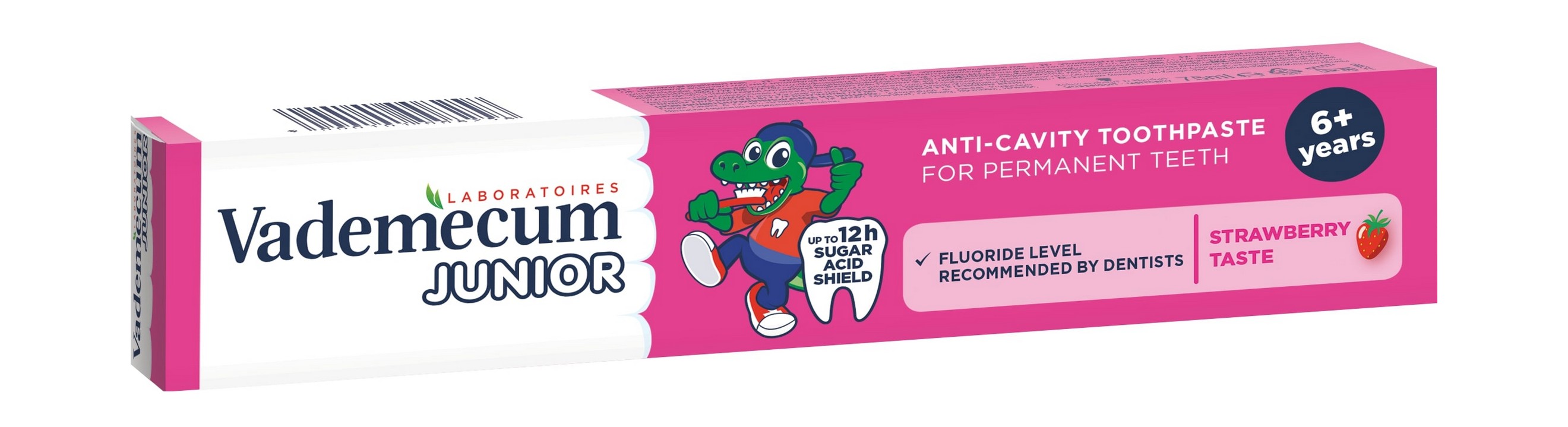 Detská zubná pasta so sviežou jahodovou príchuťou Vademecum Junior 6+ je ideálna pre obdobie výmeny mliečneho chrupu za stály. Pasta chráni pred pôsobením cukrových kyselín a vďaka obsahu vápnika posilňuje zuby.